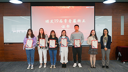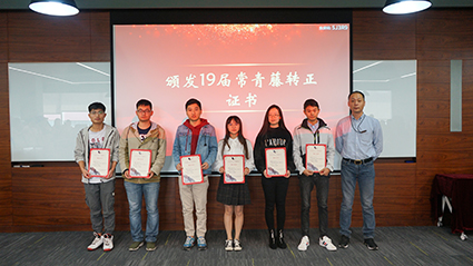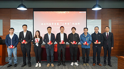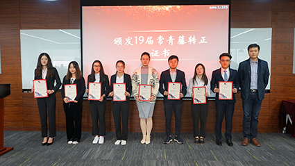 在授证及颁奖环节,各系统领导陆续上台为19届常青藤学员颁发转正证书,并为18届优秀个人颁发奖状及“一年青”徽章。副总经理张翎亲自为16届学员颁发“3年香”纪念牌,寓意三年成长,如花绽放,硕果芬芳。至此,三年期满,16届“时间胶囊”正式开罐。