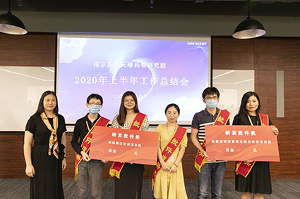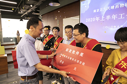为树立先进典范,砥砺团队求索创新热情,本次会议共颁发“研发成果奖”7项,分别授予2020年1-7月份成功获得批件的7个项目组团队,由田总等三位老总为获奖团队颁奖。获奖代表在现场纷纷结合项目开展过程中的特色经验、深刻经历、能力突破感想进行分享。