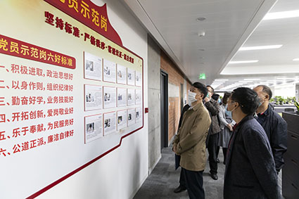 苏垦农发公司党务工作者一行先后参观了公司党员活动室、行政办公楼、培训楼、研究院等主要办公区域,详细了解各系统、各办公区域内的党建设施配置及党员占比情况,对党员活动室、党员示范岗、党建宣传栏等重点设施规划表示高度认可。